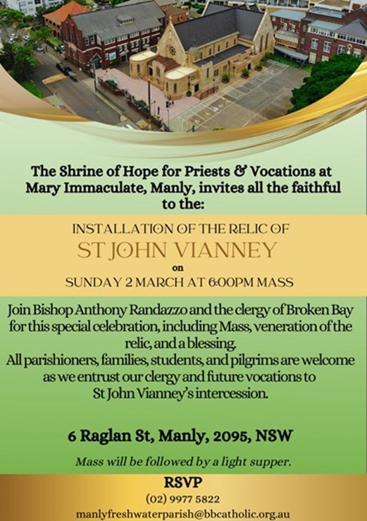 Fr Chima has invited the Stella Maris community to join the Most Reverend Bishop Anthony Randazzo and the parish community for the installation of the relic of St. John Vianney at the Shrine of Mary Immaculate on Sunday 2 March 2025, beginning with Mass at 6:00pm.
