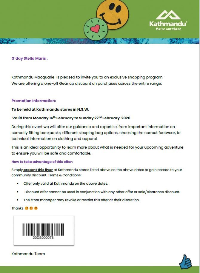 Please find attached a flyer outlining a Kathmandu discount available exclusively to Duke of Edinburgh Award participants. This offer may assist students in purchasing any gear they need for upcoming hikes.