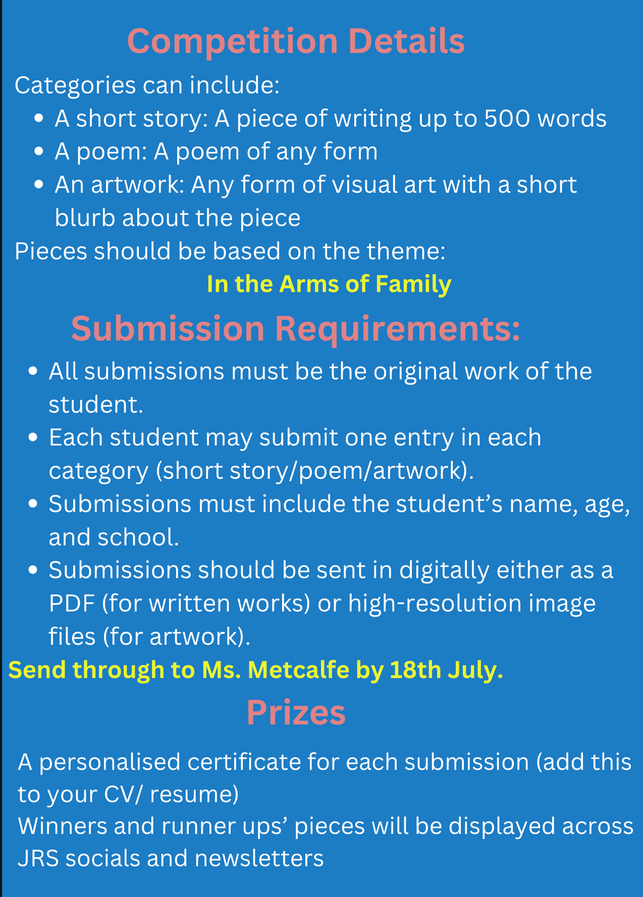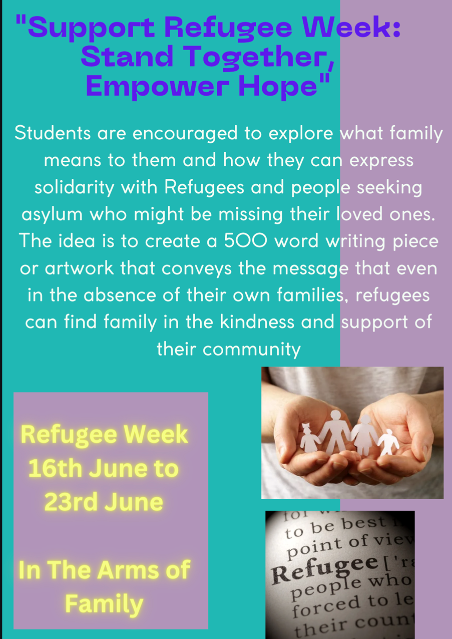 All students are encouraged to participate in the JRS Writing and Artwork competition to raise awareness in the wider community about the plight of refugees and asylum seekers. Please see the attached flyer and send in submissions to Ms Metcalfe by 18 July, 2024.