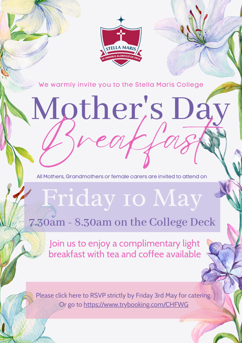 We have over 700 Stella mums, grandmothers and special female figures already registered to attend our traditional Mother’s Day Breakfast on Friday 10 May from 7.30am. Please note that RSVPs close tomorrow, Friday 3 May. Don't miss your chance to win one of over 30 prizes (valued at more than $10,000) in the P&F Mother's Day raffle. Thank you to our very generous prize donors. The raffle will be drawn just after the breakfast and winners notified by email.