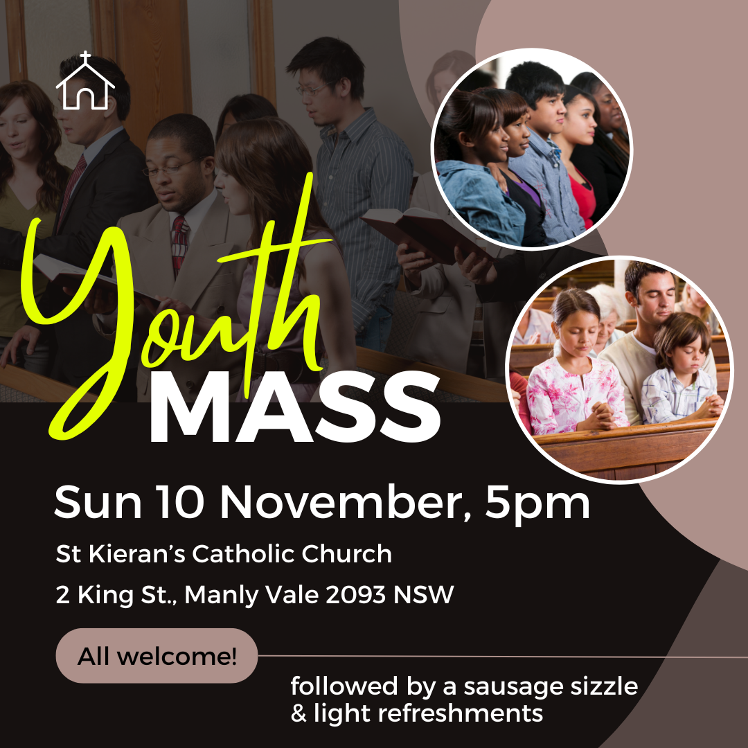The last community Youth Mass of the year will be held at St Kieran’s Parish, Manly Vale at 5.00pm on 10 November. Dinner will be served afterwards.